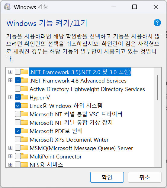 WSL 설치를 위한 사전 작업을 진행합니다. 윈도우 검색창에 "Windows 기능 켜기/끄기"를 검색하여 실행하세요. 목록 중 다음 두 항목을 찾아 체크박스에 표시하고 "확인" 버튼을 누르세요.