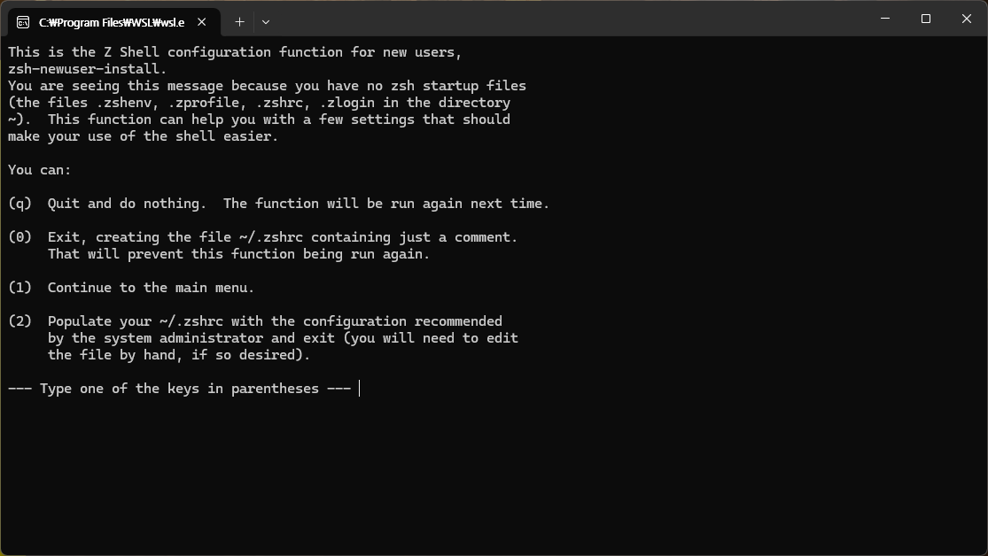 저는 2번 옵션을 선택했습니다. 하지만 초기 설정을 건너뛰는 'q' 옵션을 선택하는 경우도 있습니다. 다음 oh my zsh를 설치하는 과정에서 추가적인 초기 설정이 진행되므로, 어느 쪽을 선택하더라도 무방합니다.
