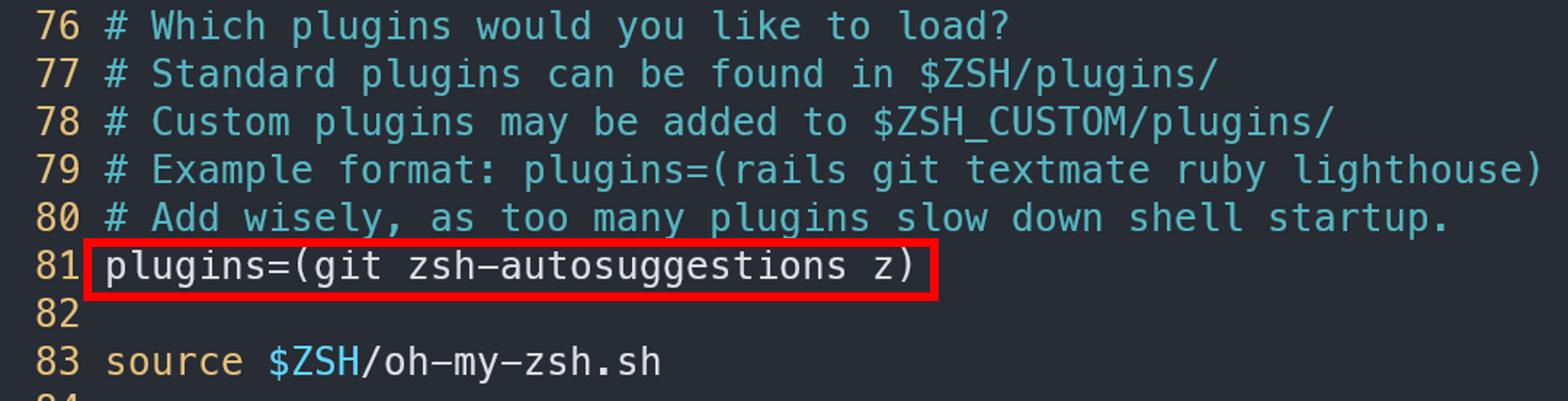 git clone https://github.com/agkozak/zsh-z ${ZSH_CUSTOM:-~/.oh-my-zsh/custom}/plugins/zsh-z~/.zshrc파일을 편집하여 플러그인을 활성화하세요.plugins=()텍스트 내 소괄호에'zsh-z'를 추가합니다.zsh-autosuggestions와 함께 사용하고 싶다면 다음과 같이 작성할 수 있습니다: